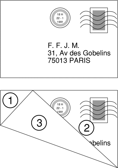 - L'enveloppe rectangulaire ci-dessous, reçue par la Fédération Française des Jeux Mathématiques, a été malencontreusement pliée (voir dessin), de telle sorte que les aires des trois triangles 1, 2, et 3, dans cet ordre, soient en progression arithmétique.